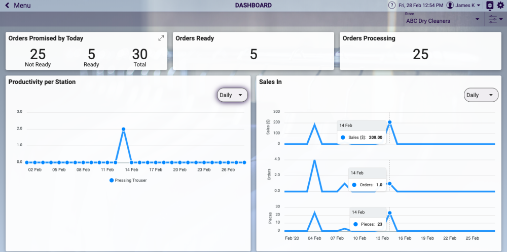 The Dashboard can also show Sales (daily, weekly, monthly) and Productivity of the store how many items have been spotted, pressed, assembled, scanned to storage by operator/employee