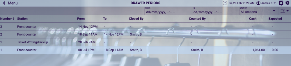 When selecting the ‘Drawer Period’ reporting icon the following drawer period listings are shown for Ticket Writing, and, Front Counter Stations