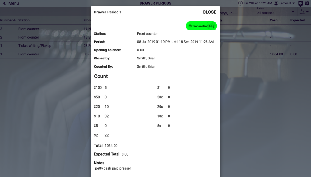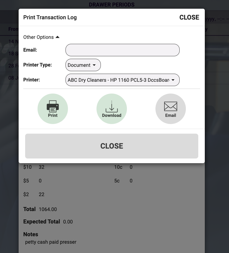 This is where you can print or display a copy of the cash drawer report select the period you would like and then you can display, print ,or, email the transaction log as shown below