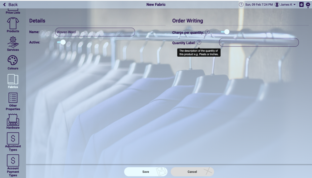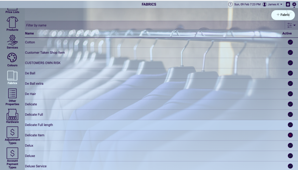 MyCleanPOS allows the addition of new fabrics as shown in the screenshot below. Fabrics are easily made active or inactive from this screen as well.