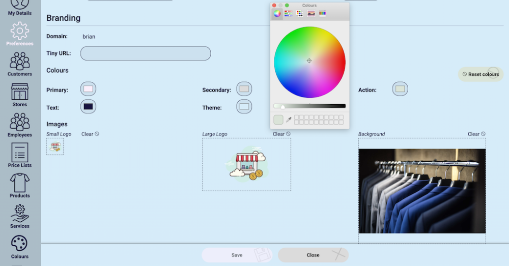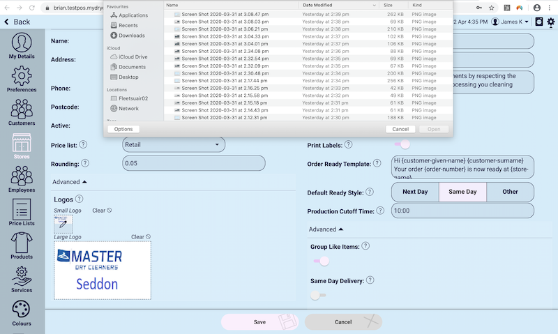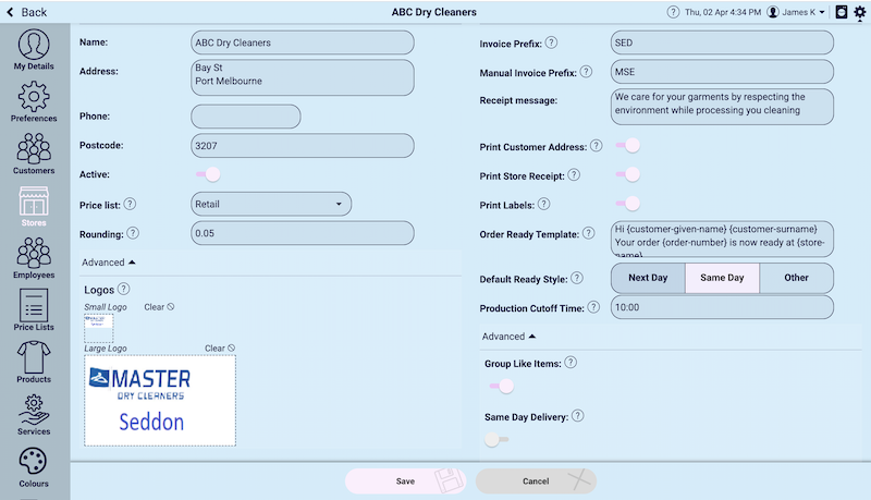 MyCleanPOS provides the ability to add a Store Logo in My Preferences, and, Stores options in Settings