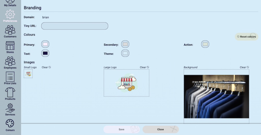 The following screen displays how the business can change colours, change branding or add company logos as required