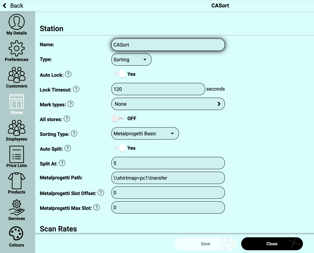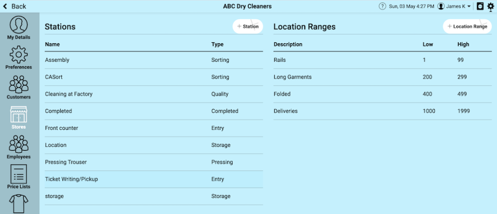 In addition to Stations, you will also see Location Ranges to the right of Stations. Locations are where you will nominate location ranges where specific garment types will be sent to nominated positions on the conveyor for assembly, bagging, and, delivery.