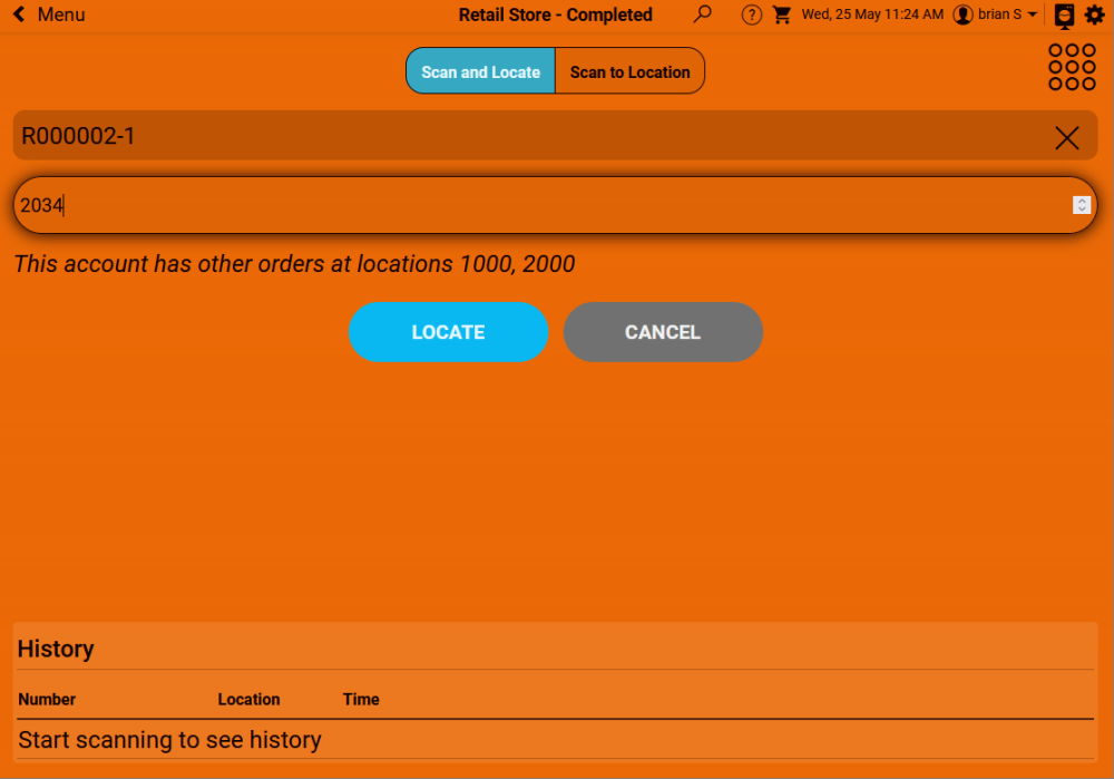 Enter a location number (if unsure, use location 1). Select the order entry box. Start scanning orders to be located.