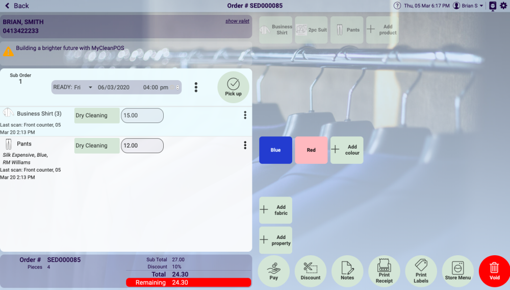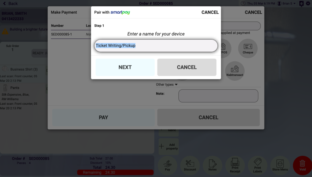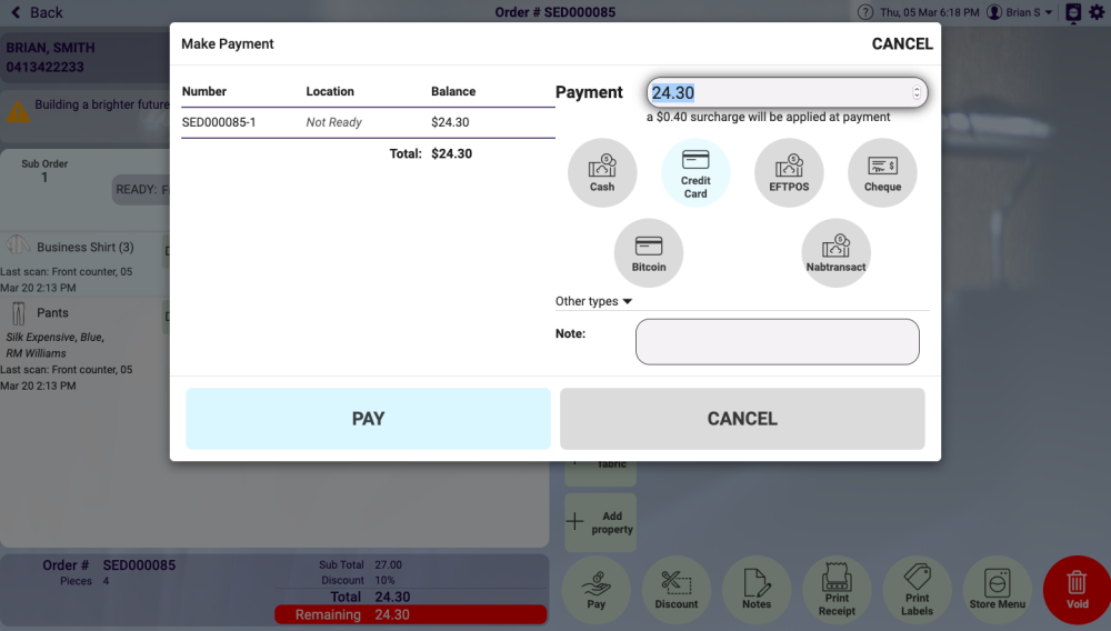 Select order to be picked up, in this case, order 85 as shown in the screen shot above, and this selection will then display the order ready for pickup as shown in the screen below. If the order details are correct the PAY button at the bottom of the screen below is selected.