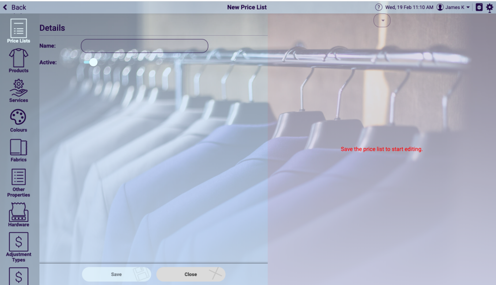 When ‘Add price list’ is selected on the top right hand corner of the screen above, the following screen shown below will allow a new price list to be added.