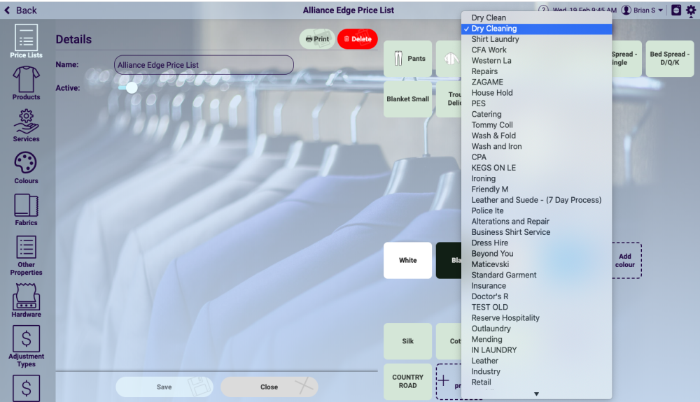 Once the price list has been selected and the service is selected, products, colours, fabrics and properties can be added, edited and deleted, as shown below.