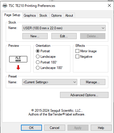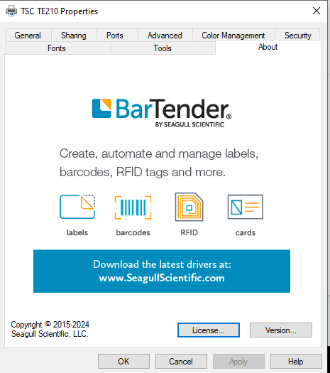 Drivers used have been provided by Bartender software/seagull scientific