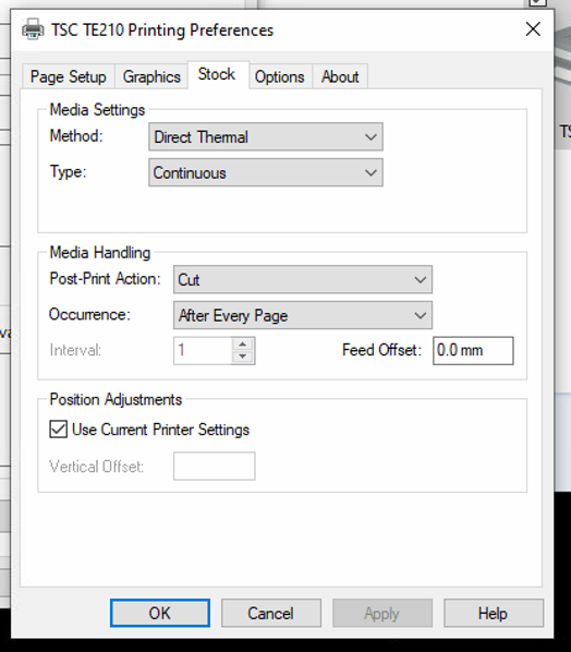 Set to Direct Thermal (unusual, but needed or else printer errors)